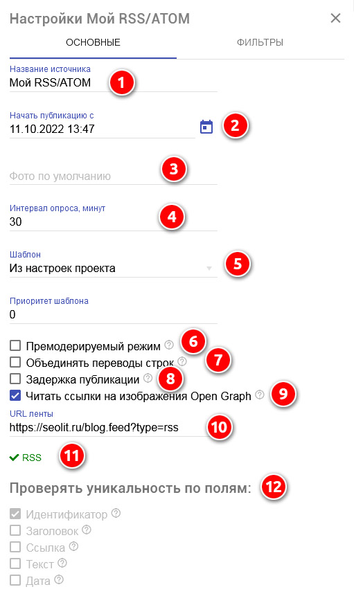 12. Здесь видны настройки для проверки уникальности постов, установленные при подключении ленты.